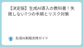 - 対策: 生成されたコンテンツを商用利用する場合は、利用するAIツールの規約を確認すること。特定の作家やキャラクターの画風を意図的に模倣するような指示を出さないこと。