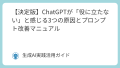 「こんにちは」「質問してもいいですか?」といった挨拶や、前提条件の確認だけで1ターンを消費するのは大きな損失です。挨拶は省略し、前提条件、質問内容、出力形式をすべて1回のメッセージにまとめて送信します。